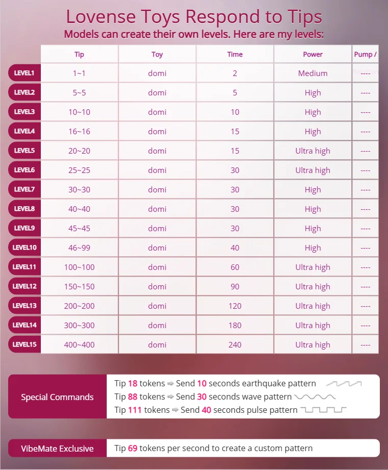 Pompino, Linguaggio esplicito, Pecorina, Giocattoli per capezzoli, Spettacolo con olio, Twerk, Spogliarello, Fumo, Ballo erotico, Topless, Gagging, Masturbazione, Gola profonda, Tittyfuck, Ahegao, Ripresa della gonna da sotto, Donna sopra, Sculacciate, Sega, Hardcore, Giocattoli erotici, Doccia, Squirt, Ditalino, Umiliazione, Orgasmo